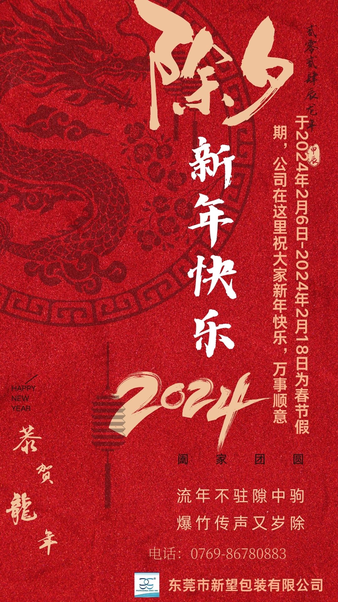 于2024年2月6日-2024年2月18日為春節(jié)假期,公司在這里祝大家新年快樂(lè),身體健康、萬(wàn)事順利!